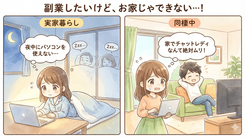 「副業で稼ぎたいけど、実家暮らしだから夜中にパソコンを使えない…」 「旦那(彼氏)と同棲しているから、家でチャットレディなんて絶対ムリ!」